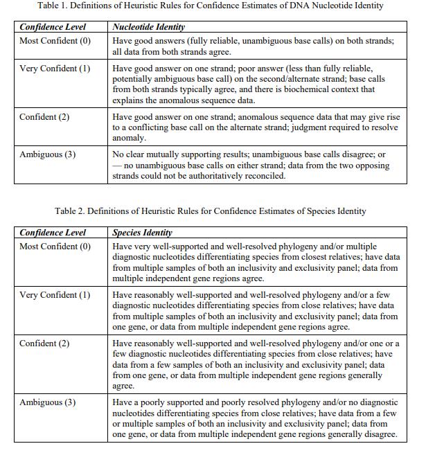 NIST SRM 3246銀杏葉(葉子)經認證的物種鑒定是銀杏,來自 psbA-trnH 基因間間隔區和 trnL 內含子區域的相關葉綠體 DNA 序列可在伴隨的 FASTA 格式文件中獲得 [1]。與序列中每個核苷酸相關的不確定性,以及與作為物種標識符的 DNA 序列相關的不確定性,以表示對規定值的信念強度的序數尺度表示(0 = 最有信心,1 = 非常有信心,2 = 有信心,3 = 模棱兩可)(表 1 和表 2)[2]。