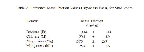 表 2 中提供了溴、氯、鎂和錳的參考值,以基于干質(zhì)量的質(zhì)量分?jǐn)?shù) [1] 表示。參考值是最佳估計值的非認證值的真實價值;但是,該值不符合 NIST 的認證標(biāo)準(zhǔn),并且提供了相關(guān)的不確定性,該不確定性可能僅反映測量精度,可能不包括所有不確定性來源 [2]。