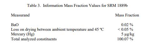 表 3 中報告了成分的信息值、環境溫度和 45 oC 之間的 LOI 以及總分析成分的信息值。信息值被認為是 SRM 用戶可能感興趣的值,但沒有足夠的信息來評估與值相關的不確定性 [2]。信息值不能用于建立計量溯源性。