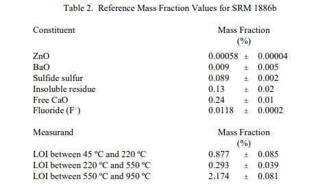 表 2 中報告了成分和燒失量 (LOI) 的參考值。NIST 參考值是未經認證的值,是基于可用數據對真實值的當前最佳估計;但是,該值不符合 NIST 認證標準,并提供了相關的可能僅反映測量重現性的不確定性,可能不包括所有不確定性來源,或可能反映多種分析方法之間缺乏足夠的統計一致性 [2]。