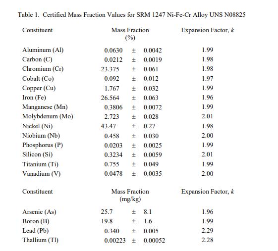 參考質量分數值在表 2 中給出。參考值是未經認證的值,是當前對真實值的最佳估計;但是,這些值不符合 NIST 的認證標準 [2],并且提供了相關的不確定性,這些不確定性可能僅反映測量精度,可能不包括所有不確定性來源,或者可能反映多種分析方法之間缺乏足夠的一致性。